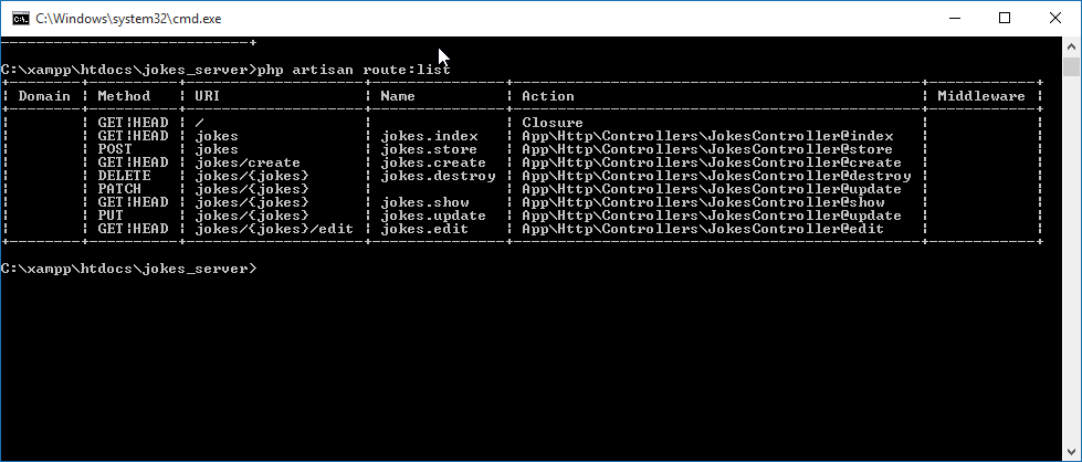Now have a look at the database, you can see the new jokes table there. Along with jokes table, laravel creates three other tables namely users, migrations, password_resets.