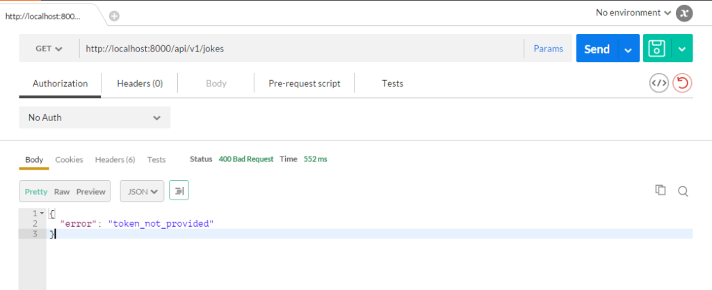 Now try to hit the route, /api/v1/jokes, you will get an error token not provided like this: