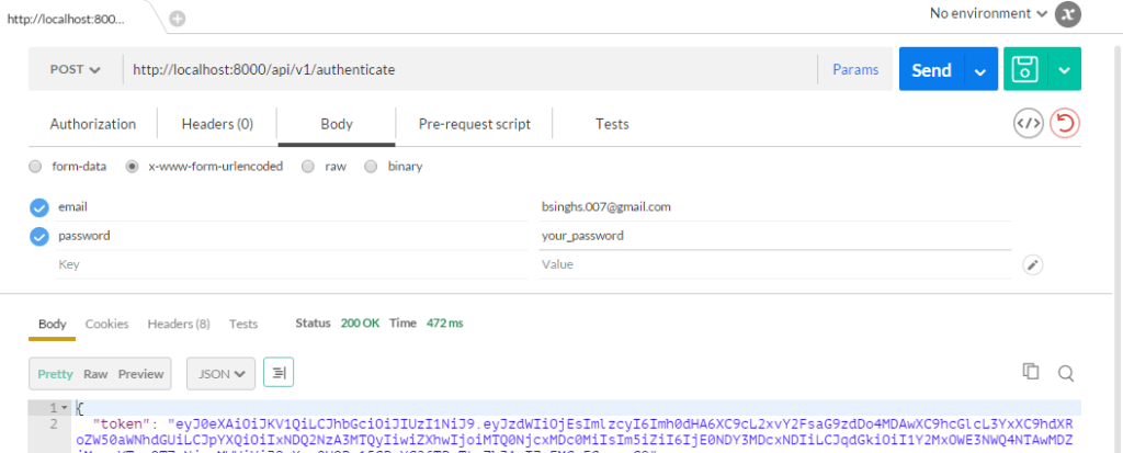 Which means, we first need to generate token that we can generate by sending post request to api/v1/authenticate with email and password as following: