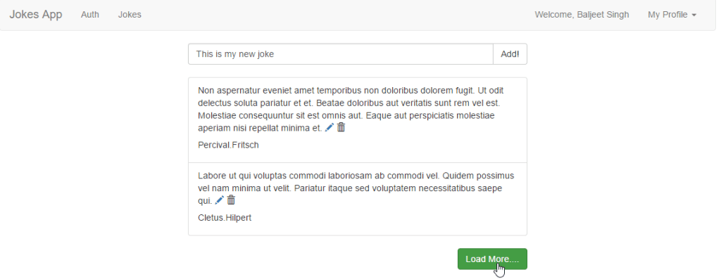 Now open the jokes routes and click load more button, you can see the new data jokes loaded in the view.